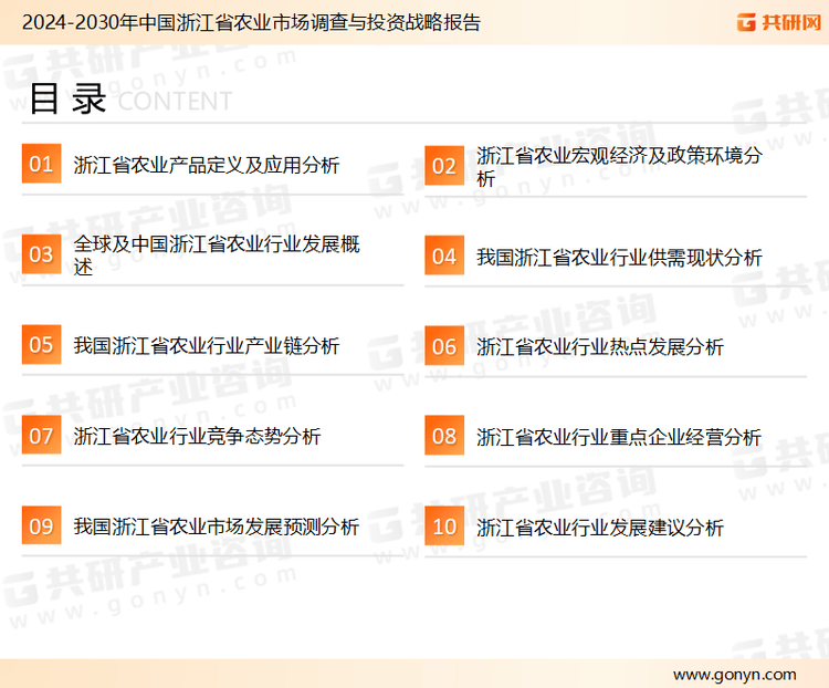 為確保浙江省農業行業數據精準性以及內容的可參考價值,共研財產研究院團隊通過上市公司年報、廠家調研、經銷商座談、專家驗證等多渠道開展數據采集工做,并使用共研自從成立的財產闡發模子,連系市場、行業和廠商進行深度分解,可以或許反映當前市場現狀、熱點、動態及將來趨向,使從業者可以或許從多種維度、多個側面分析領會當前浙江省農業行業的成長態勢。