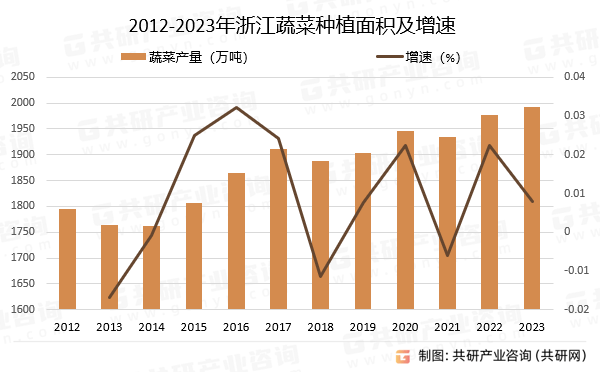 近年來,浙江積極成長蔬菜、食用菌等農業從導財產,不竭優化農業出產布局,積極鞭策特色農業成長,添加綠色優良農產物供應,蔬菜產量躍居農產物產量首位。2012-2023年,浙江蔬菜產量從1794。38萬噸波動增加至1992。51萬噸,增加了198。13萬噸,增幅為11。04%。