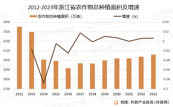 2012-2016年,浙江農做物總種植面積呈逐年下降態勢,谷值為2016年的2919。68萬畝;受省及相關部分持續出臺的農業財產相關政策的激勵,2017-2023年,浙江農做物總種植面積波動回升,并于2020年再次跨越3000萬畝,2023年已達3062。08萬畝,因種植業高度依賴地盤資本,估計后期農做物總種植面積仍將不變正在3000萬畝以上。