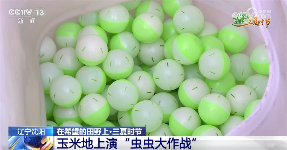 這個長相酷似乒乓球的綠色小球就是本地用來對于害蟲玉米螟的兵器,它叫蜂球,需要利用無人機進行投放。記者發覺,這些蜂球布滿了孔洞,里面則是白色的蟲卵。